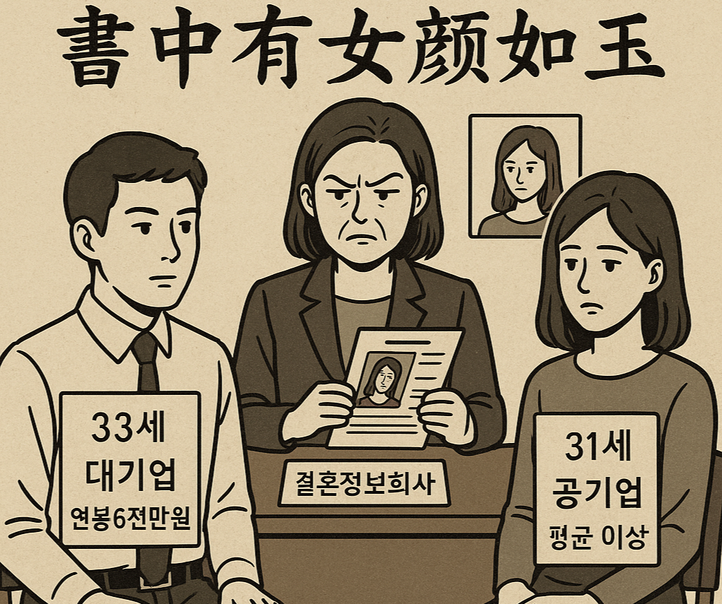 대한민국에서 30대는 결혼의 데드라인이라 불린다. 남성은 보통 군 복무와 사회 초년생 시기를 거쳐 30대 초중반에 이르러 결혼 시장에 본격 진입하고, 여성은 20대 후반에서 30대 초반 사이에 ‘가장 상품성 있는 시기’를 지나게 된다. 이 시기의 남녀는 단순히 배우자를 찾는 것이 아니라, 자신이 지금껏 공부해 온 결과물의 시장 가치를 시험받는 것과 다름없다.