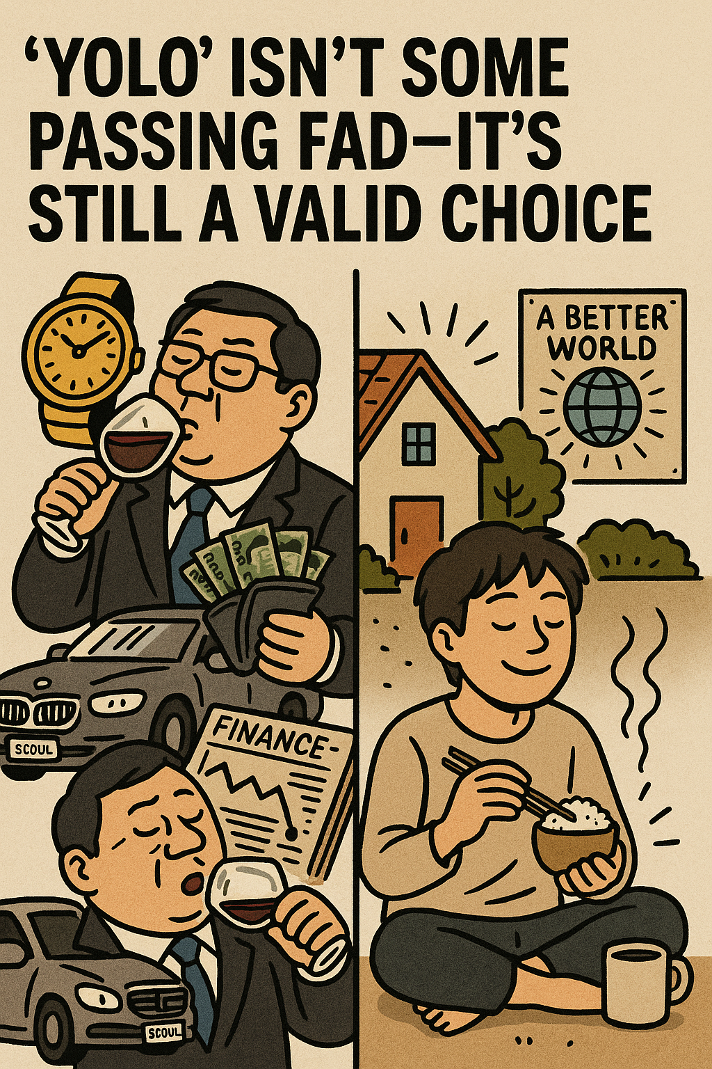 이 둘은 욜로를 단순한 일탈이 아닌 '자기 삶의 설계도'로 삼았다. 그들은 욜로의 표면적인 소비문화가 아닌, 본질적인 자기 선택과 우선순위에 집중했기에 만족을 얻은 것이다.